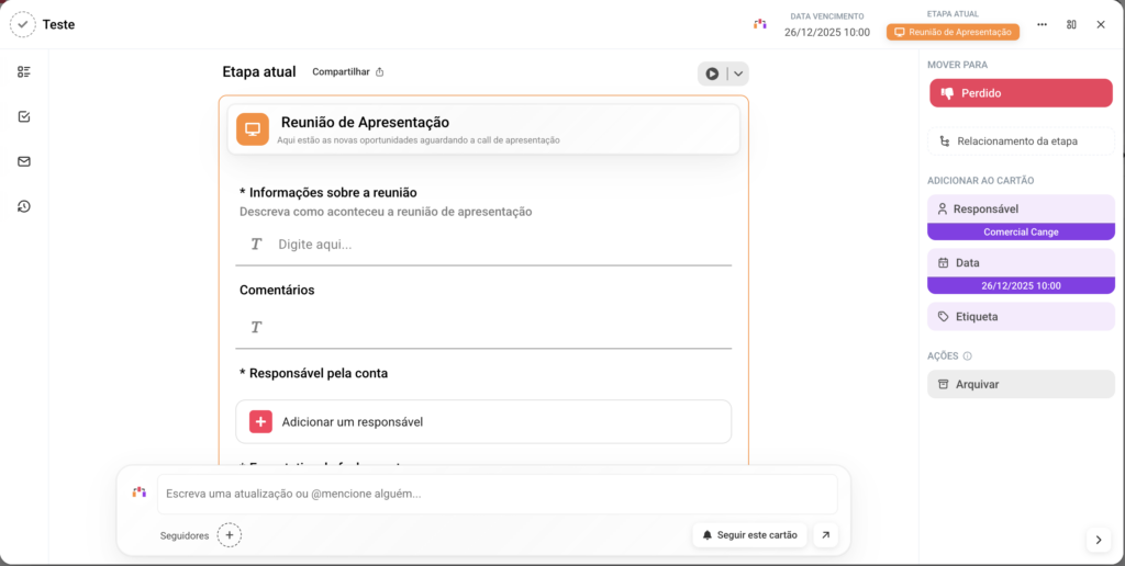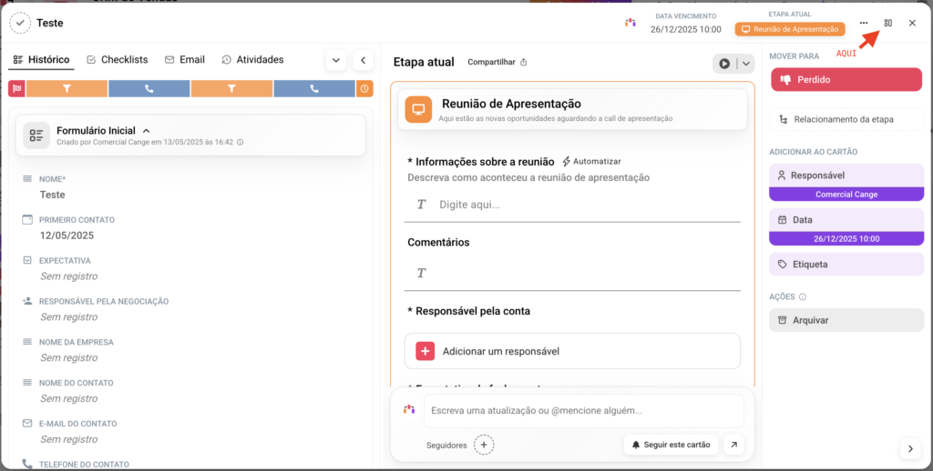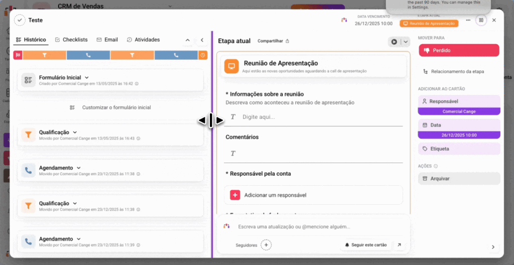 Por padrão, o histórico do cartão exibe o título da etapa e, logo abaixo, todos os campos com seus respectivos preenchimentos.