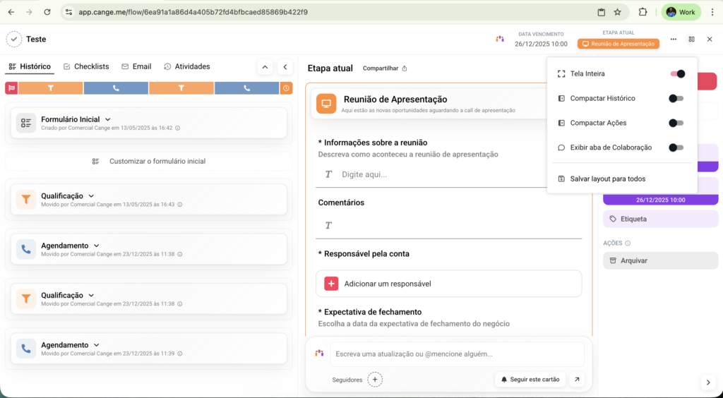 As opções de visualização estão disponíveis dentro do próprio cartão, no menu de exibição (ícone de layout), localizado ao lado do botão de Fechar do cartão..