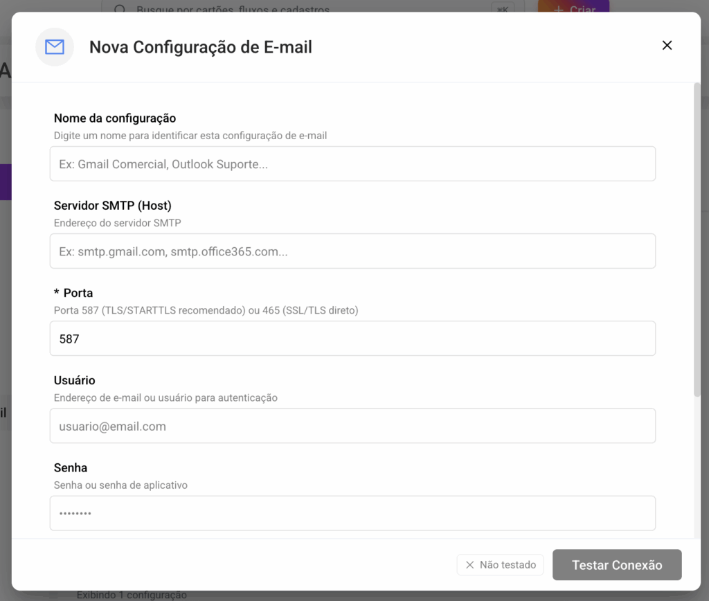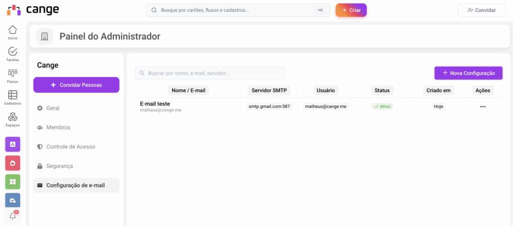 Com a nova funcionalidade de Configuração de SMTP, você pode usar seu próprio servidor de envio, personalizando totalmente os e-mails enviados pelos seus fluxos.