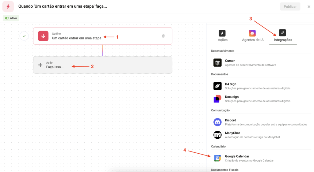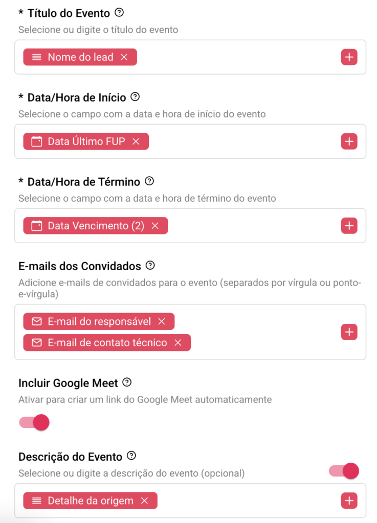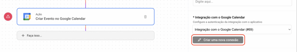 Integrações → Google Calendar → Criar novo evento no Google Calendar