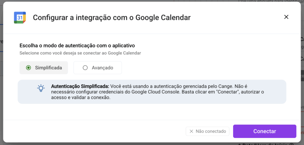 No modal que será apresentado, escolha entre Simplificada (Recomendada) ou Avançado e depois clique em Conectar.