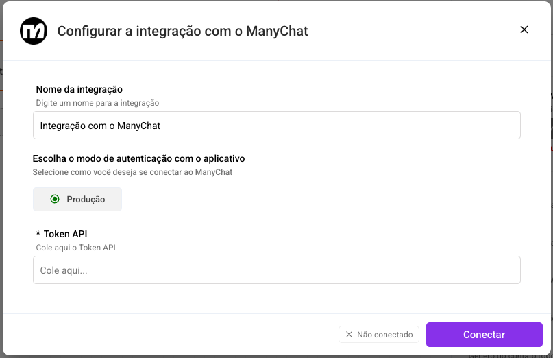 Cole aqui seu API Token obtido diretamente no painel do ManyChat.