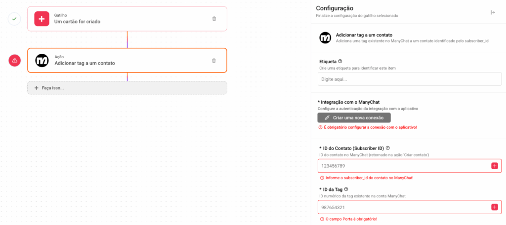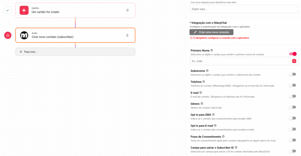 Essa ação permite criar automaticamente um contato no ManyChat sempre que um fluxo for executado.