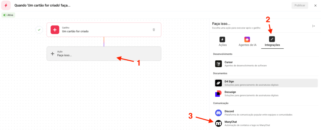 Automação → Escolha um gatilho → Ação → Integrações → ManyChat